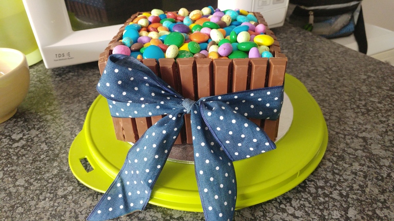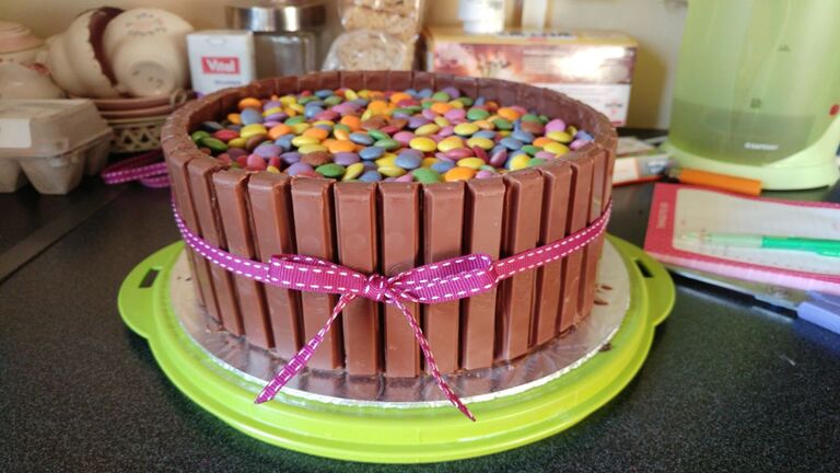 2 Layer Chocolate cake with Buttercream Icing, finished with KIt Kat and Smarties