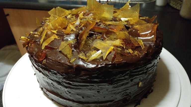 2 Layer Chocolate cake with Caramel Icing and finished with Caramel Popcorn