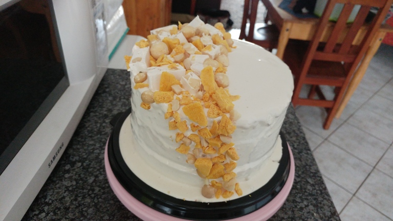 3 Layer Chocolate cake with Nougat icing and Macadamia, Nougat and Honeycomb detail