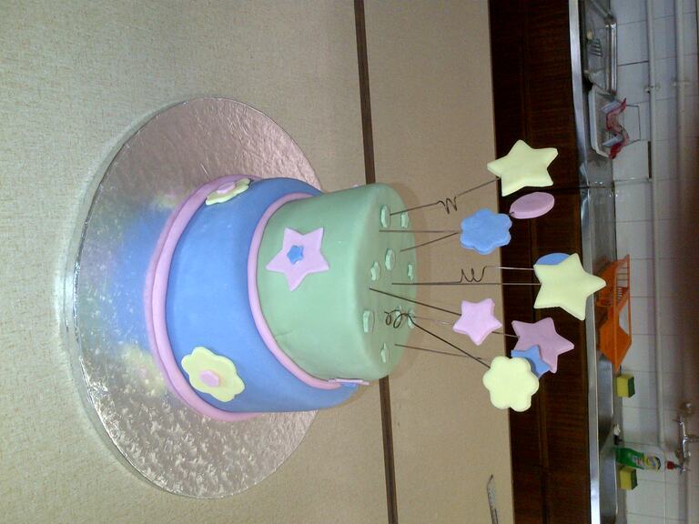 Topsy Turvy theme - 2 Tiered 2 Layer Vanilla cake with buttercream Icing covered in Fondant and with Fondant detail